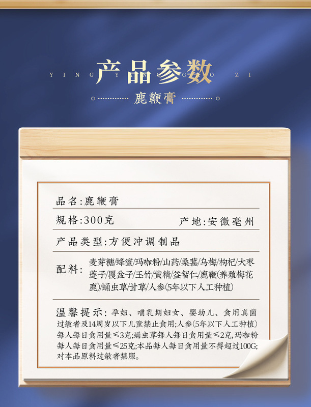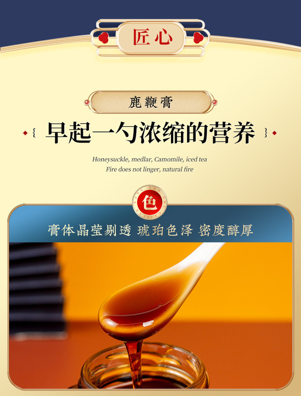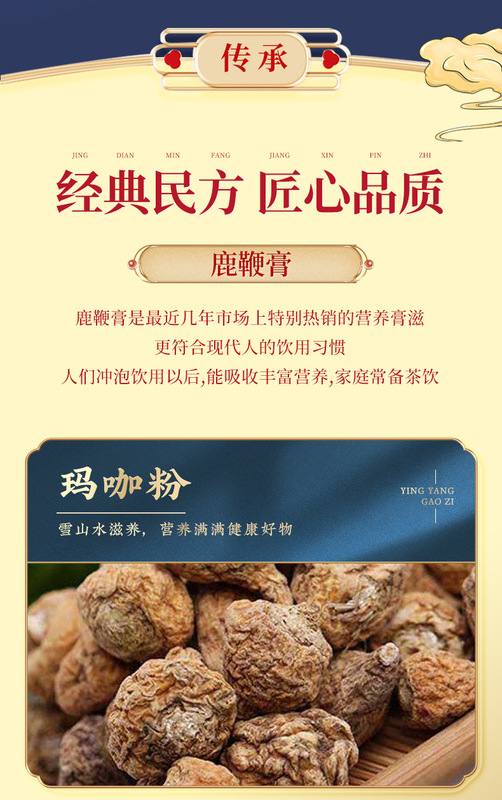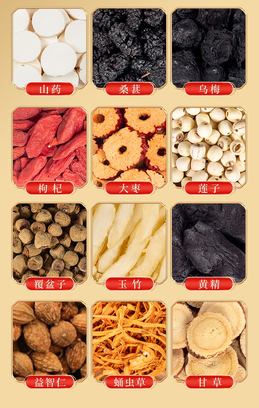 - Main Ingredients: Malt Sugar, Honey, Maca Powder, Chinese Yam, Mulberry, Wu Mei, Goji Berry, Red Date, Lotus Seed, Emblica officinalis, Yellow Lianthus, Ophiopogon japonicus, Deer Antler, Cordyceps militaris, Licorice, Ginseng