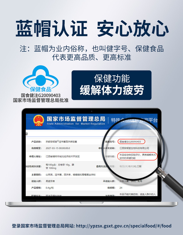 - Health Claim: This product has been evaluated through animal experiments and is found to have the health function of relieving physical fatigue