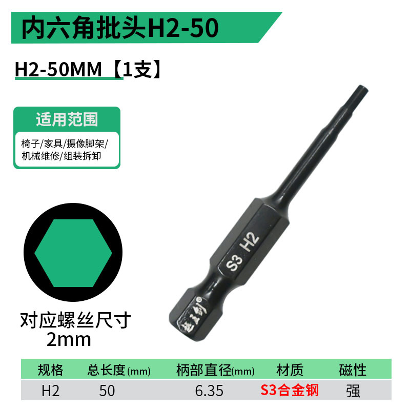 - 規格型號:內六角批頭【H2】50MM