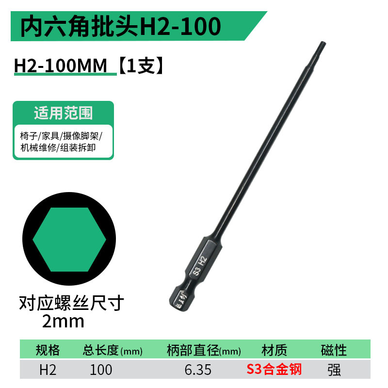 - 規格型號:內六角批頭【H2】100MM