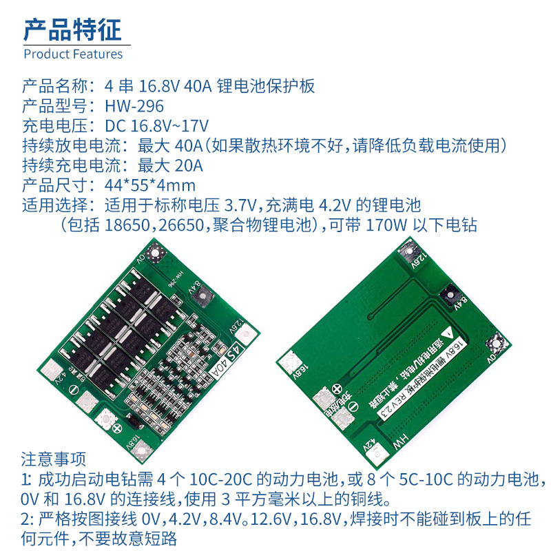 - Model: 4-串40A Lithium Battery Protection Board (Enhanced Version)