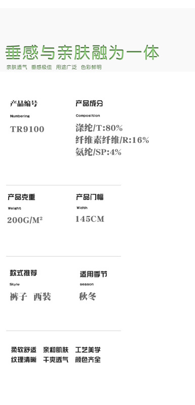 - 成分及含量:滌綸/T:80%纖維素纖維/R:16%氨綸/SP:4%