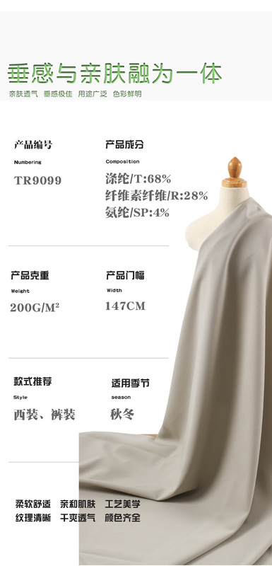 - 成分及含量:滌綸/T:68%纖維素纖維/R:28%氨綸/SP:4%