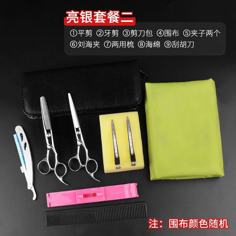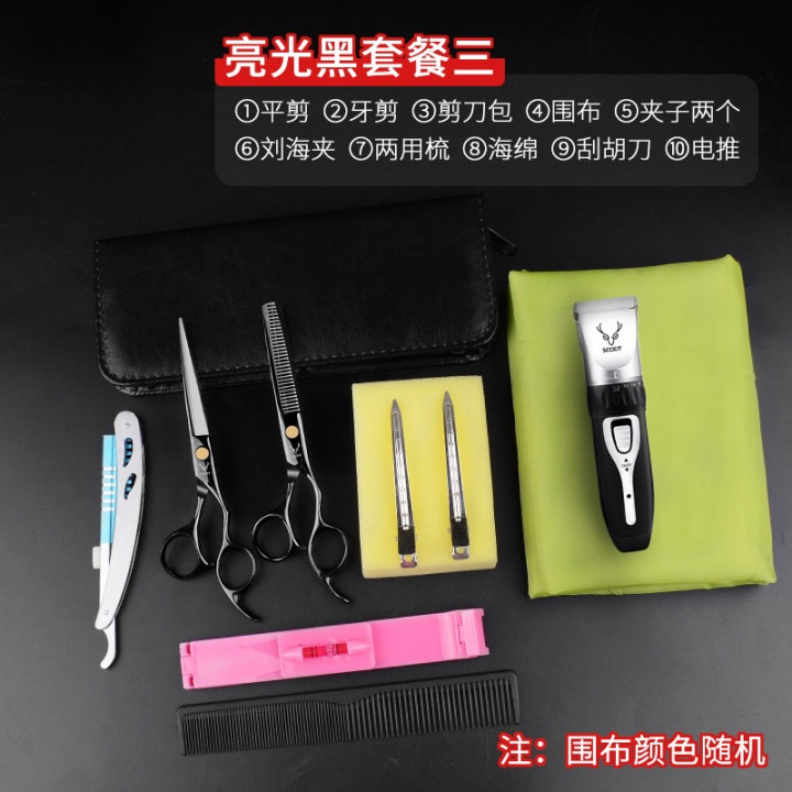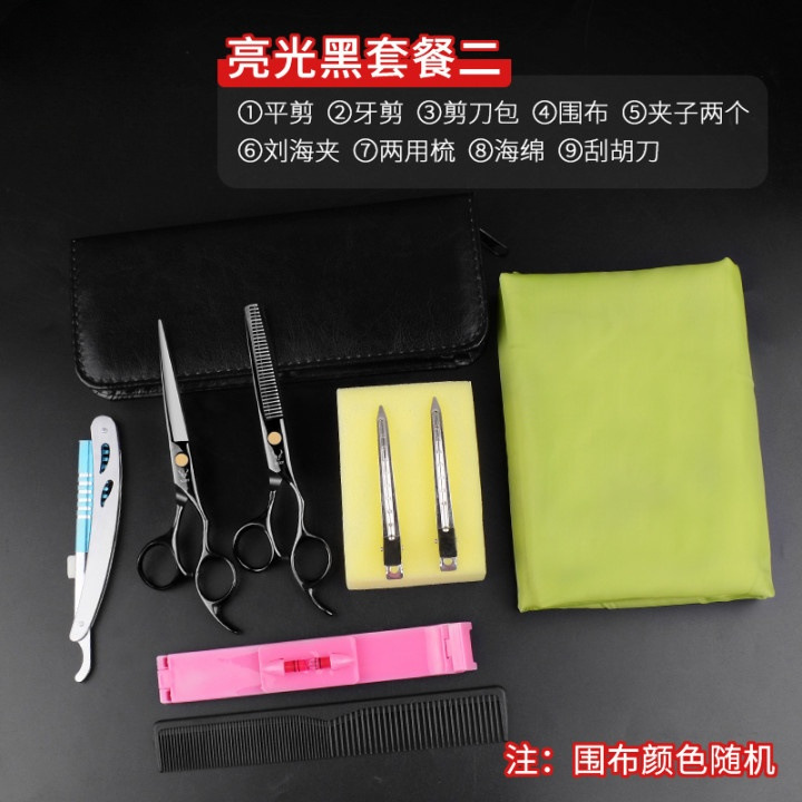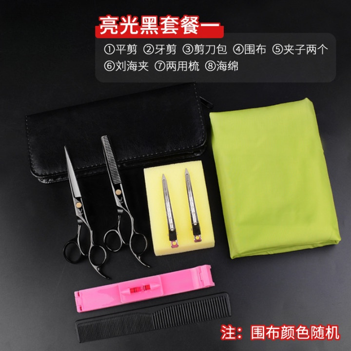 - Model: HJ-60 (Black) Straight Scissors + Tooth Scissors + Leather Case + Apron Magic Sponge Clips Steel Knife +