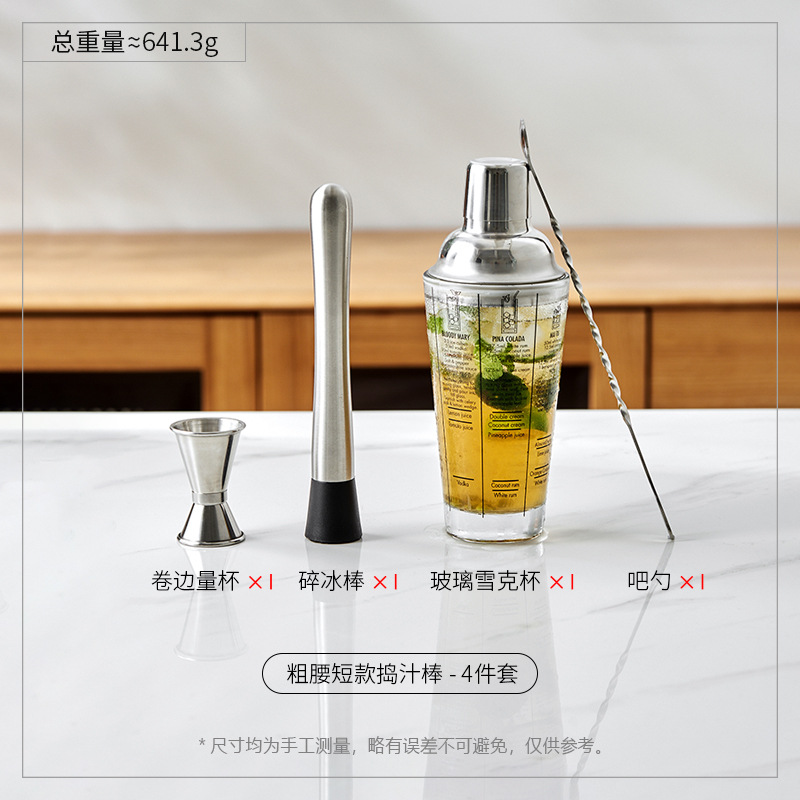 - 規格:4件套-粗腰20.6cm搗汁棒+玻璃雪克杯+量杯+吧勺