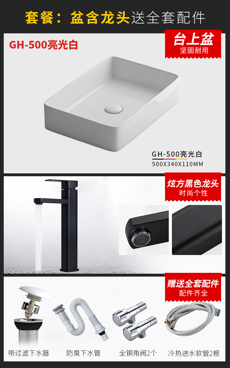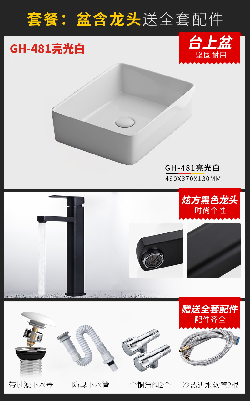 - Specification: 480mm bright white basin + faucet package