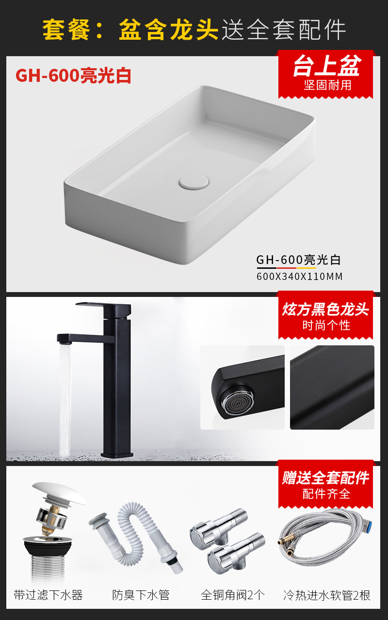 - Specification: 600mm bright white basin + faucet package