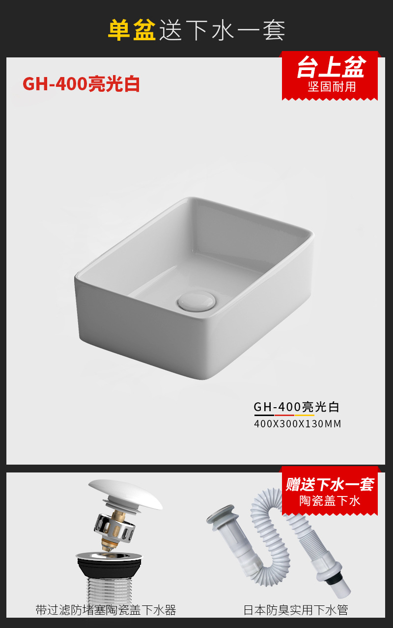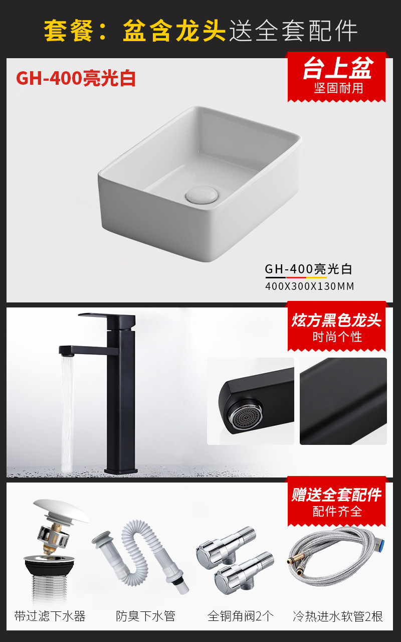 - Specification: 400mm bright white basin + faucet package