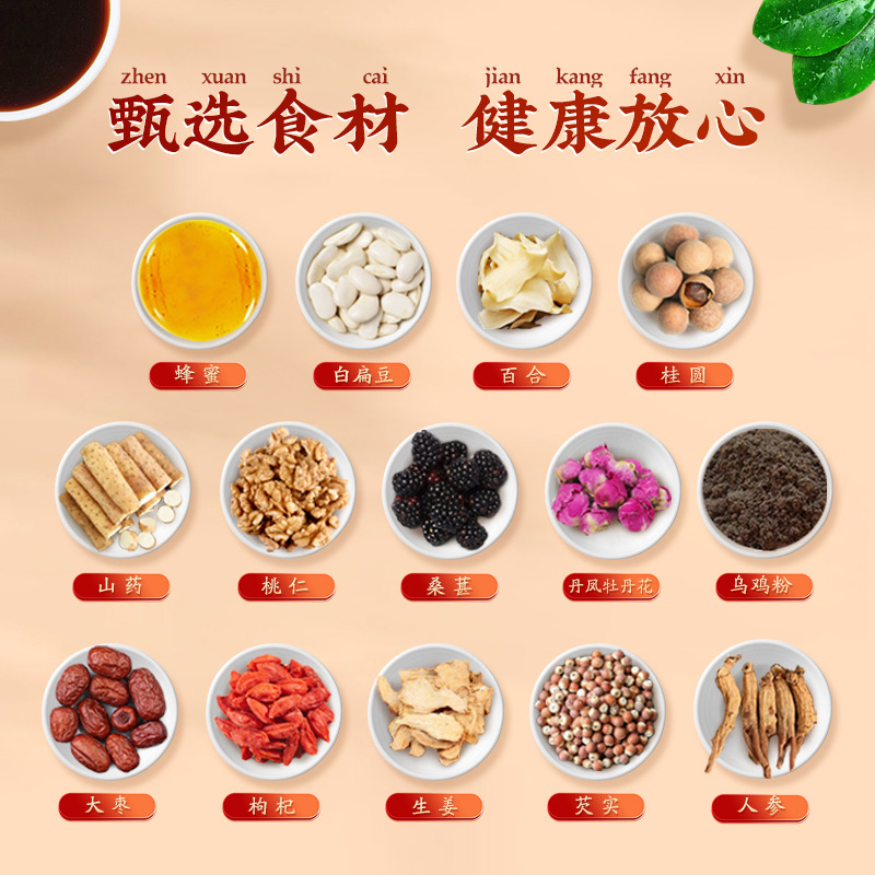 - Main Ingredients: Malt Syrup, Honey, White Chicken Powder, Longan, Lily Bulb, Goji Berry, Jujube, Chinese Yam, Phoenix牡丹 Flower, Ginseng (Artificially Cultivated for Less than 5 Years)