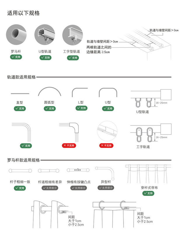 - Specifications: Upgraded model - 2 universal Roman rod track remote control options