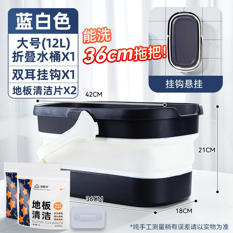 - 容量:【36cm以下拖把用】摺疊水桶-藍白色+掛鈎+地板清潔片