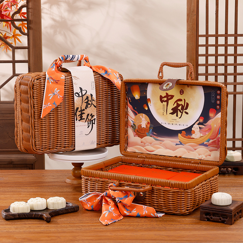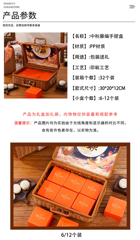 - Specification model: Mid-Autumn wicker hand-pull basket (32*23.5*14CM); 12 pieces set (includes cover + small box)