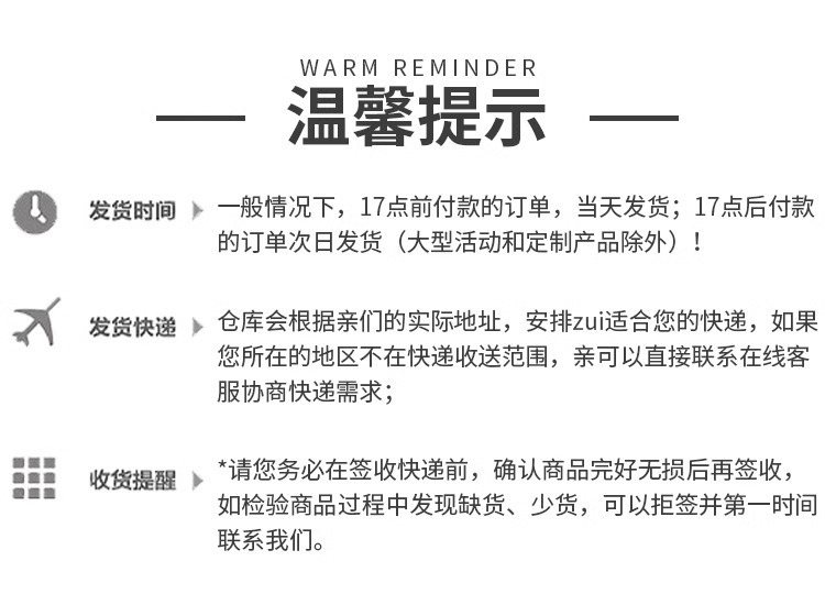Delivery time: For products in stock, they will be shipped within 3 working days (excluding holidays) after you place your order and make payment. You will receive our notification after shipment.