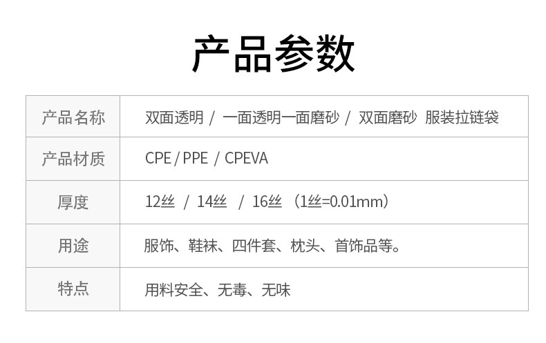 - Specification model: 18x20cm*CPE*Double-sided frosted 16 Denier