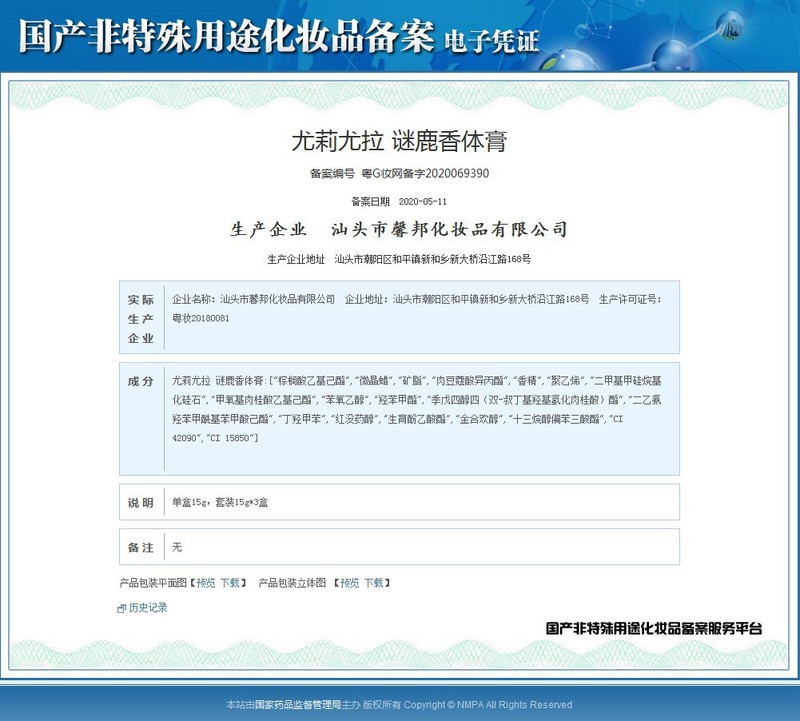 - Non-Special Use Cosmetic Filing Number: Yue G Scent Network Filing Number 2020069390