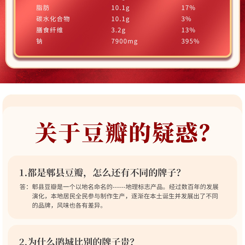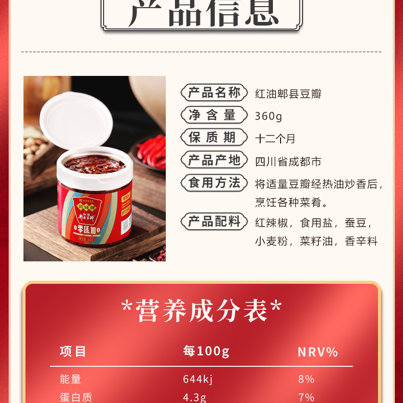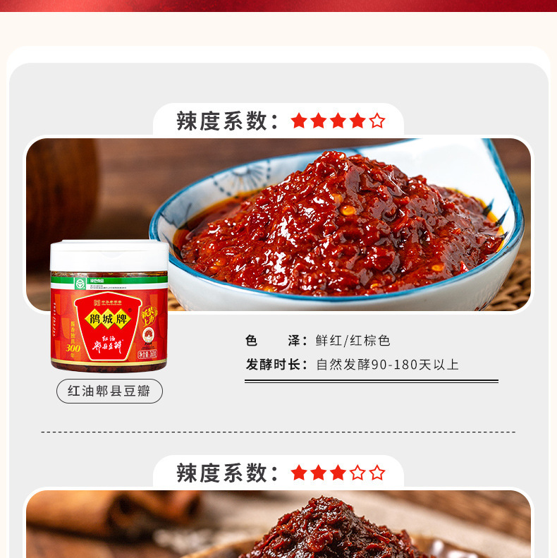 - Ingredients and Components: Red chili peppers, broad beans, edible salt, wheat flour, etc.