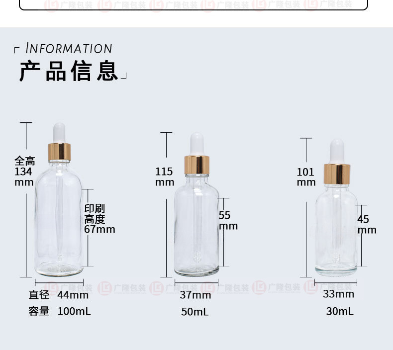 - Specification and model: 30ml (330 pieces/box) full box shot; Golden double tangent cover; Glass
