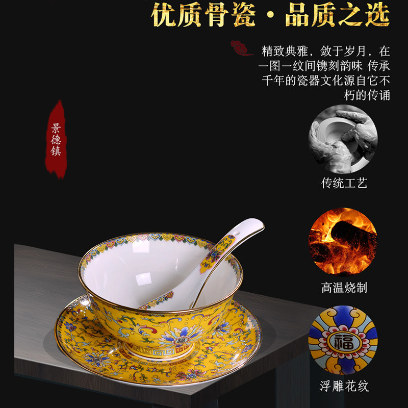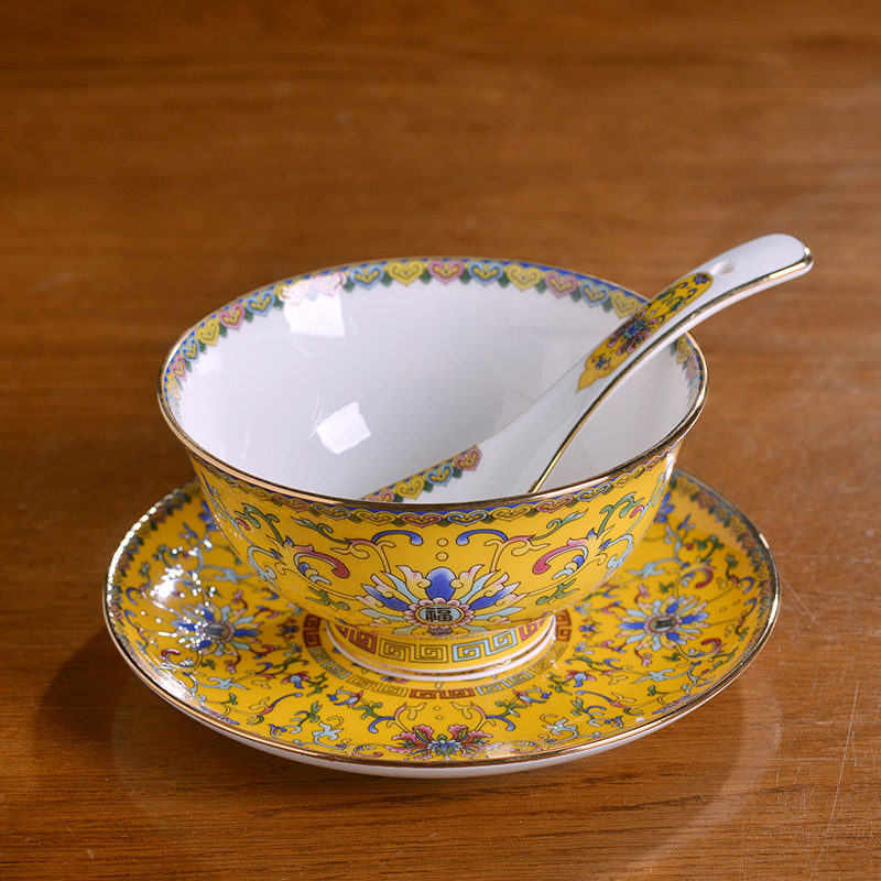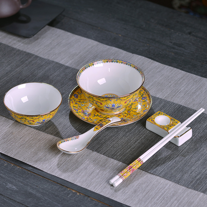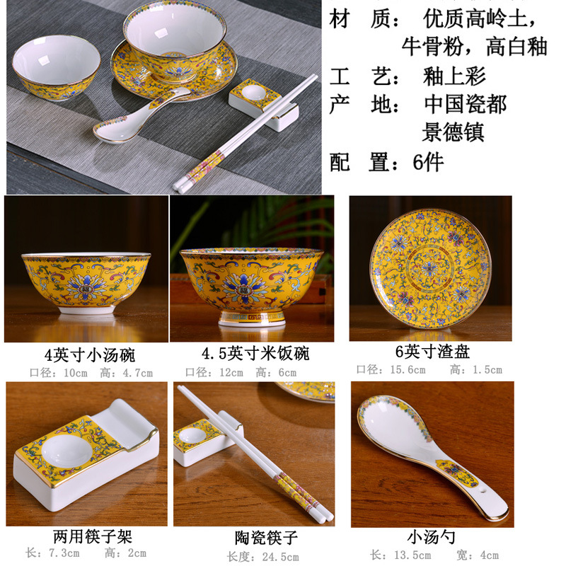 - Specification: 6-Piece Set Gold-Edge Yellow-Frost Enamel