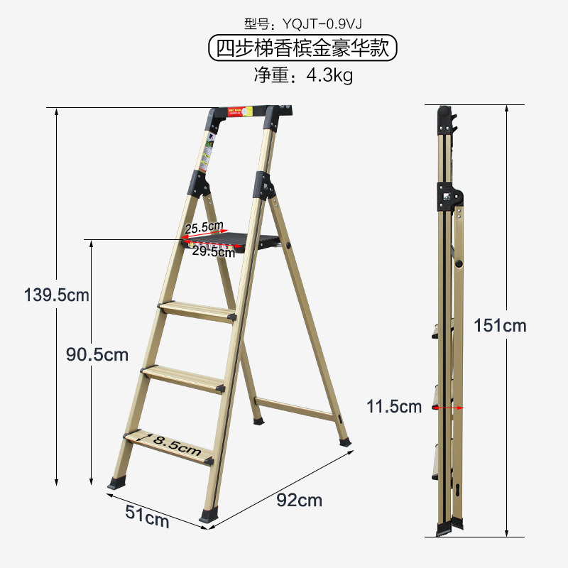 - Number of steps: Thickened new champagne gold luxury 4-step ladder - 0.9VJ