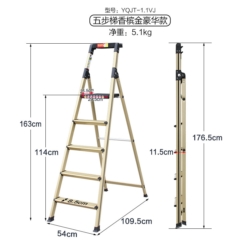- Number of steps: Thickened new champagne gold luxury 5-step ladder - 1.1VJ