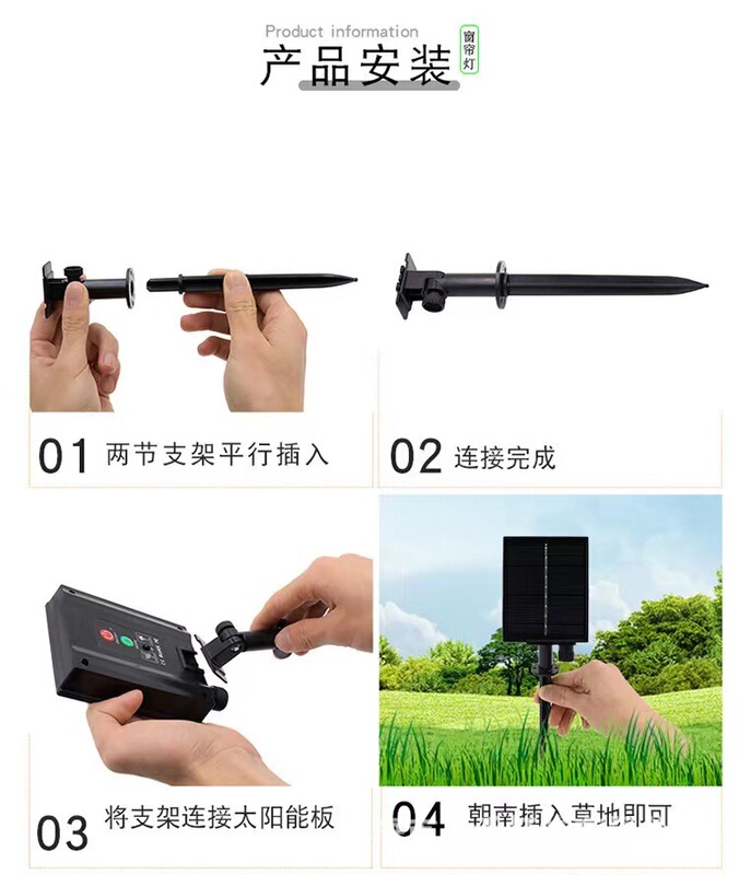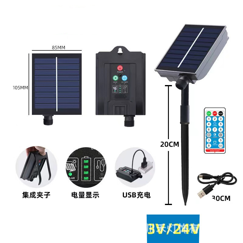 - Power: remote control solar + usb charging 8 functions