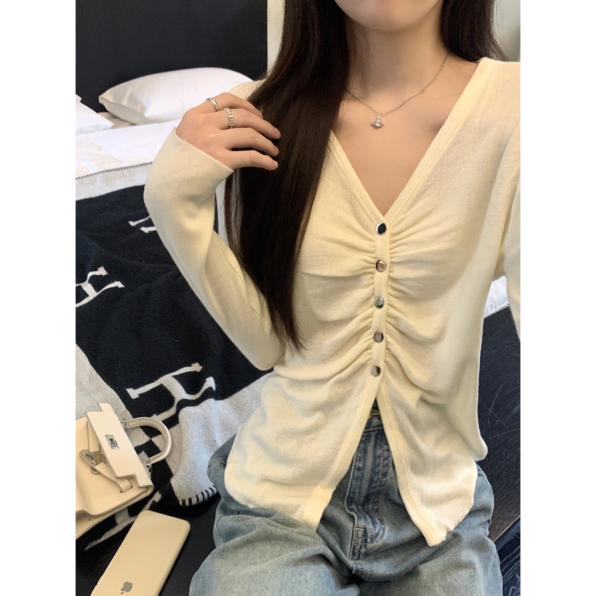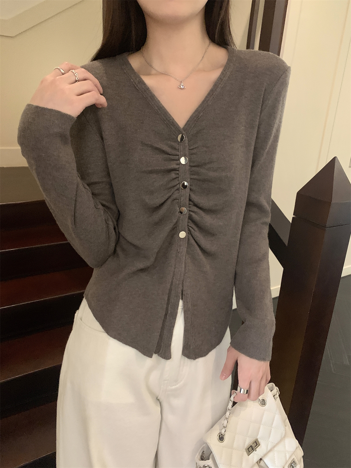 - Collar: V-neck
