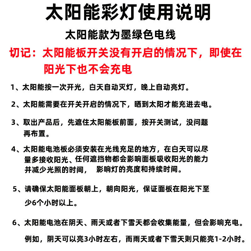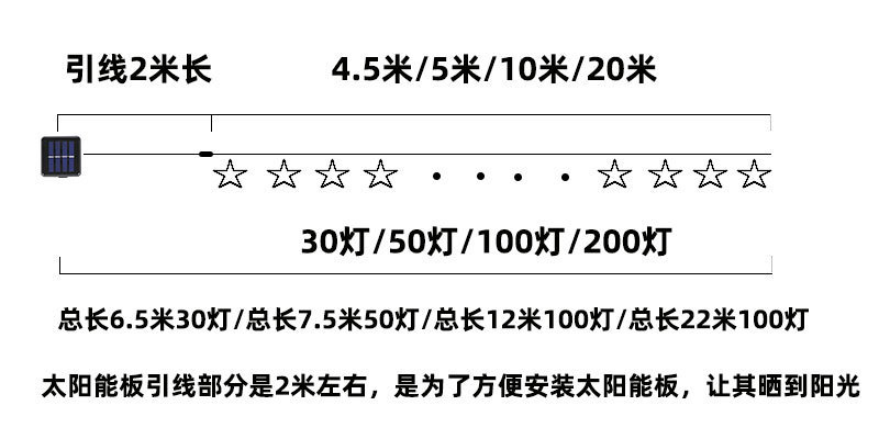 - Power: 20 lights, 5 meters, eight-function solar model (green line)