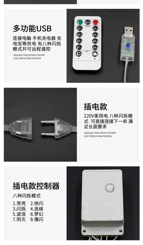 - Power: 10 meters, 80 flashing lights, USB with remote control