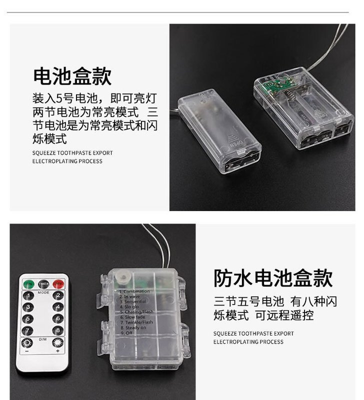 - Power: 10 meters, 80 lights, three sections, always on with flashing battery box + USB dual use
