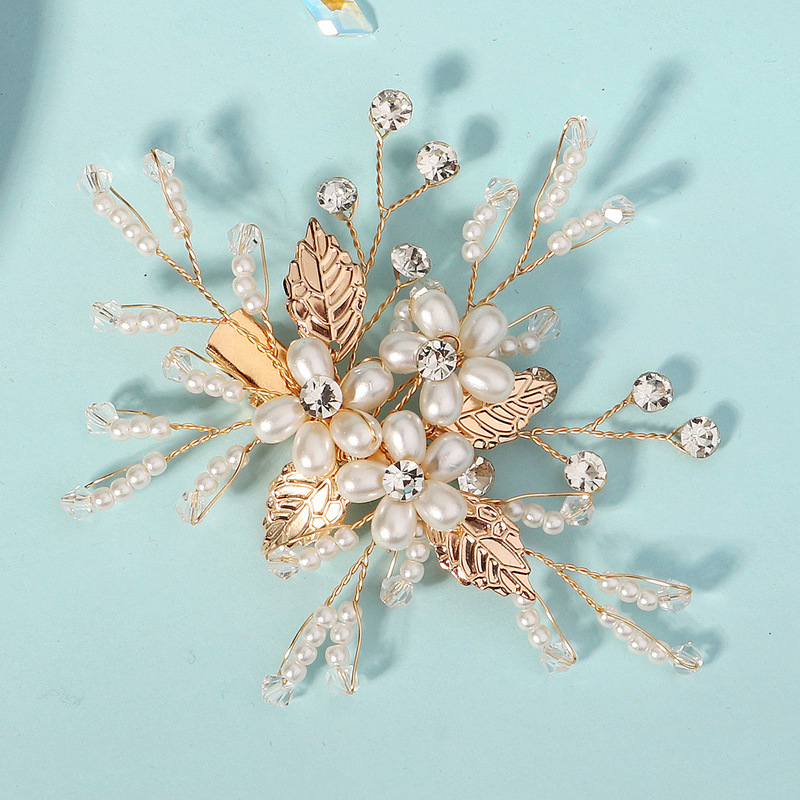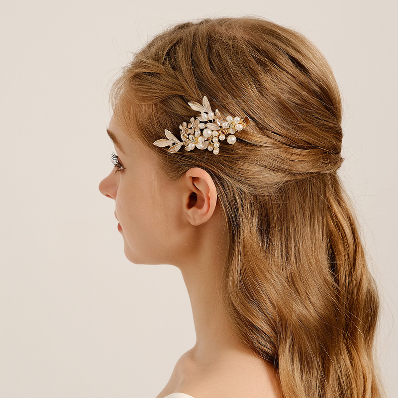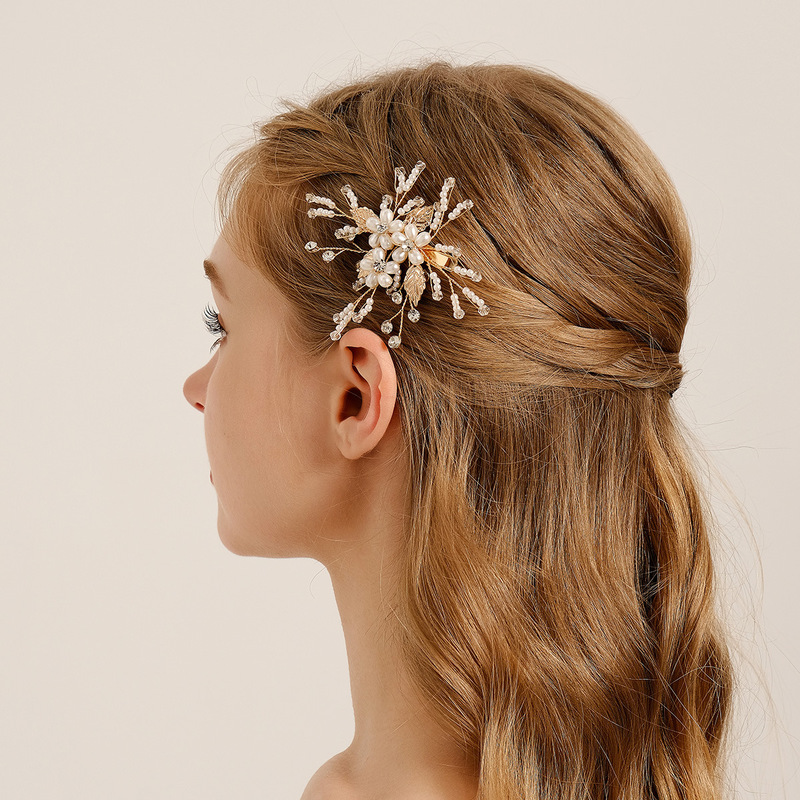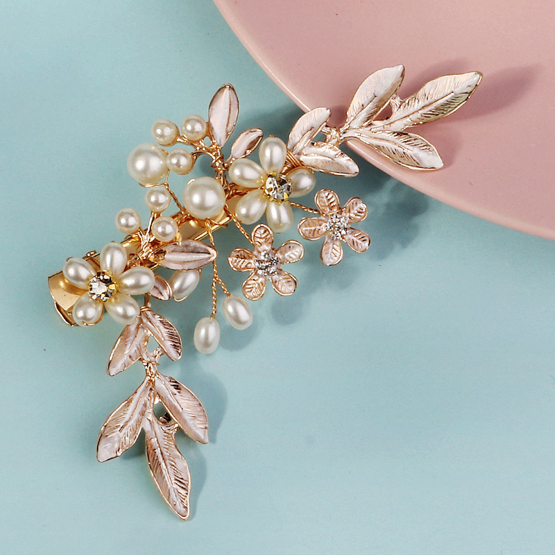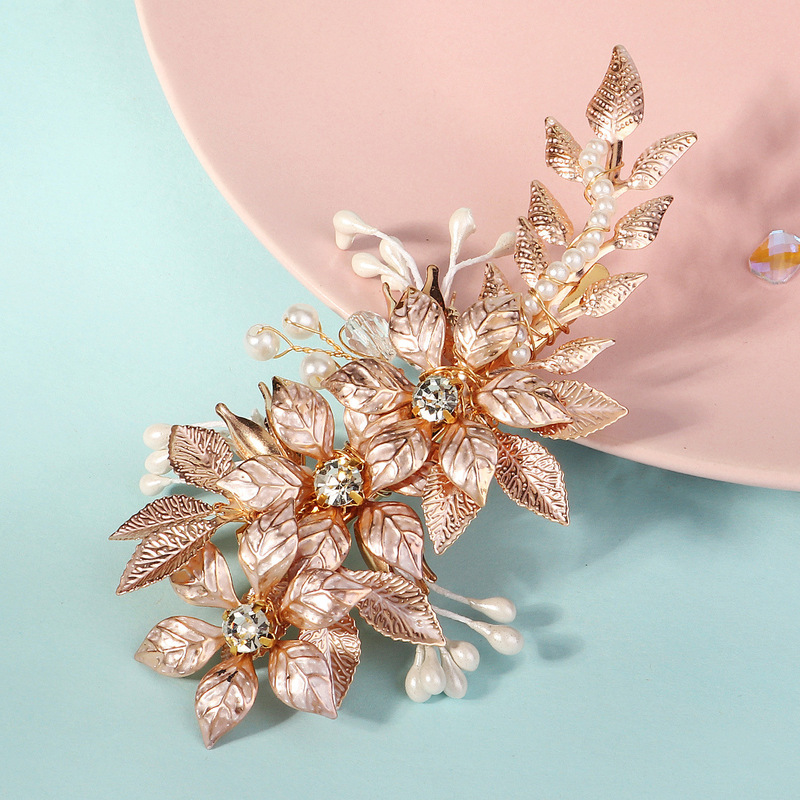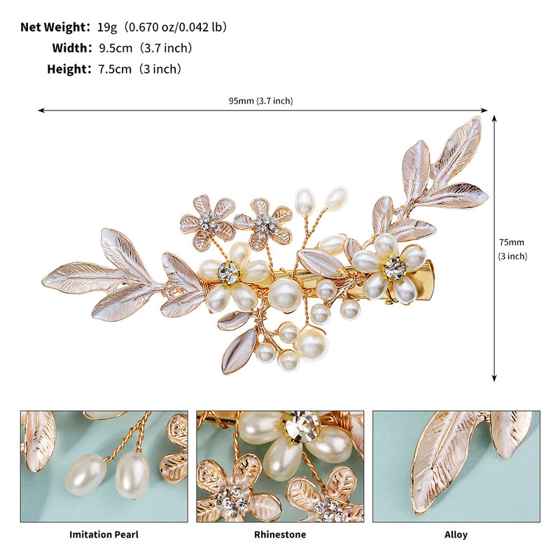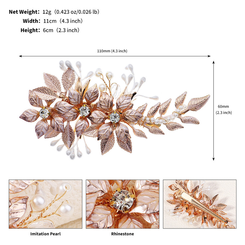 - Elements: Hand-beaded alloy pearl copper wire wound crystal leaf rhinestone hairpin duckbill clip