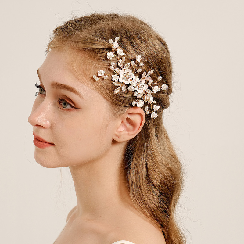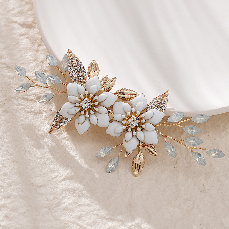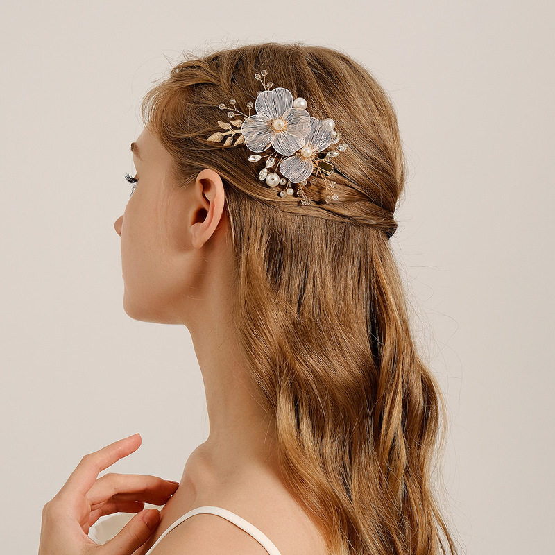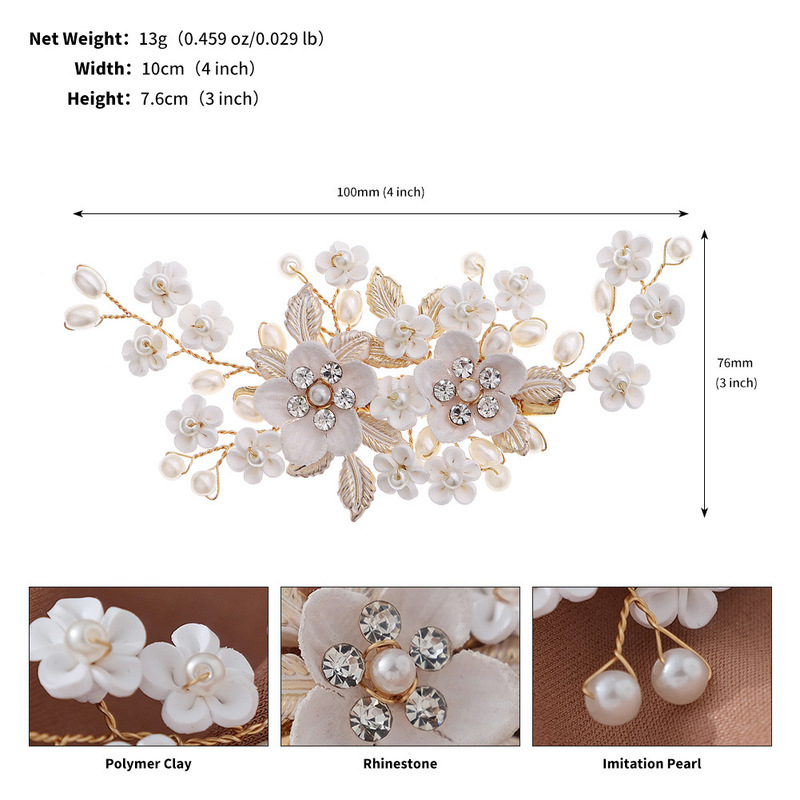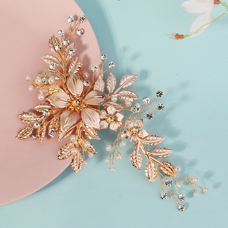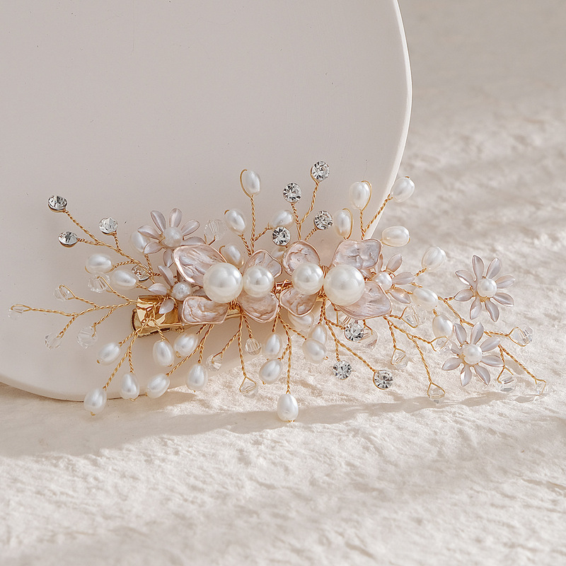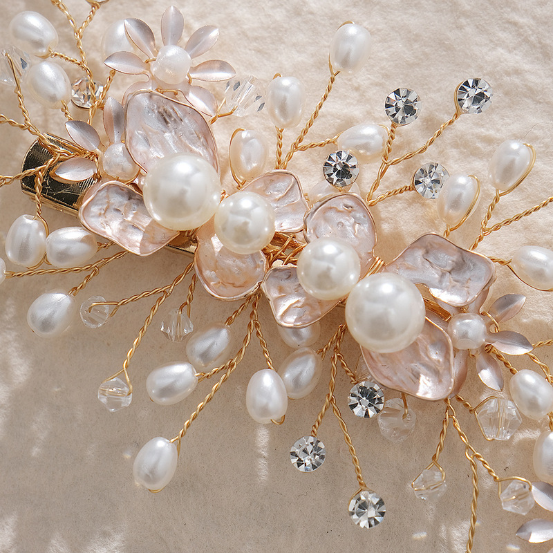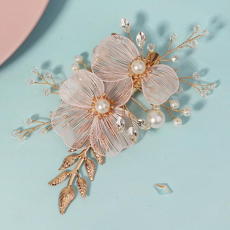 - Elements: Hand-beaded alloy pearl copper wire wound crystal leaf rhinestone hairpin duckbill clip