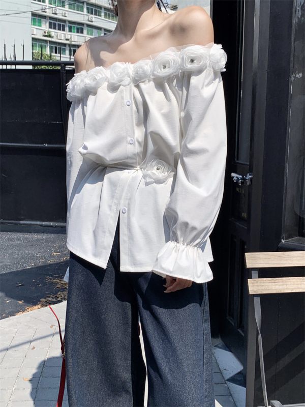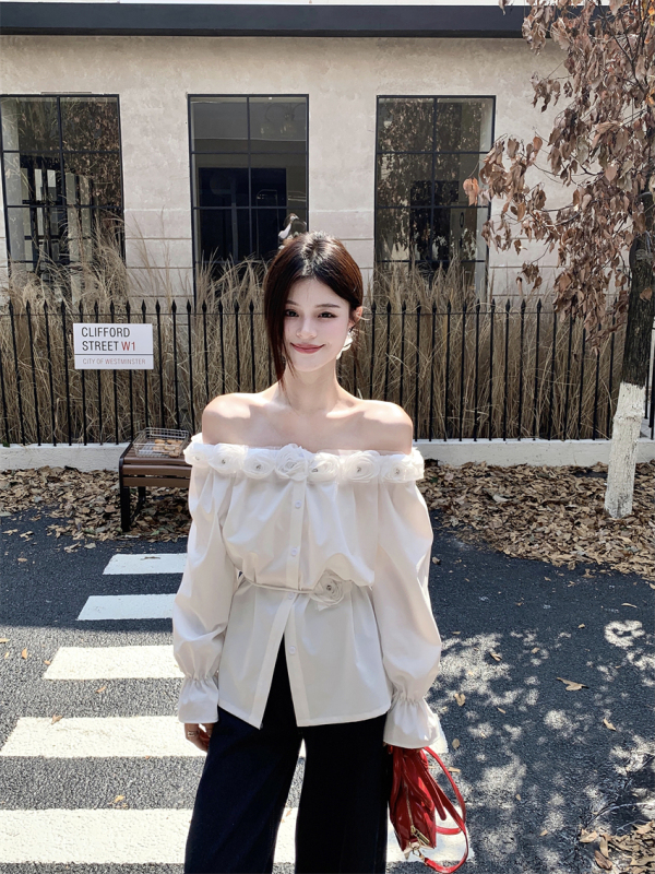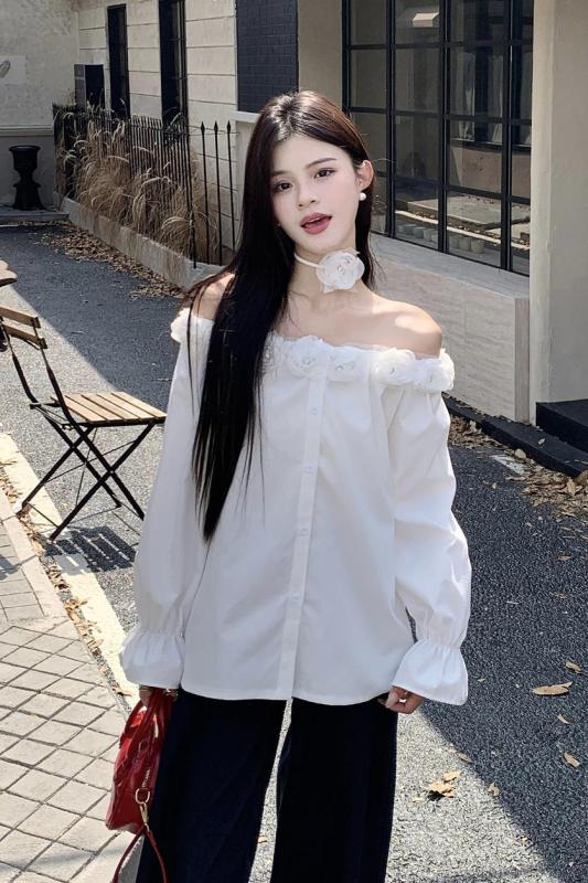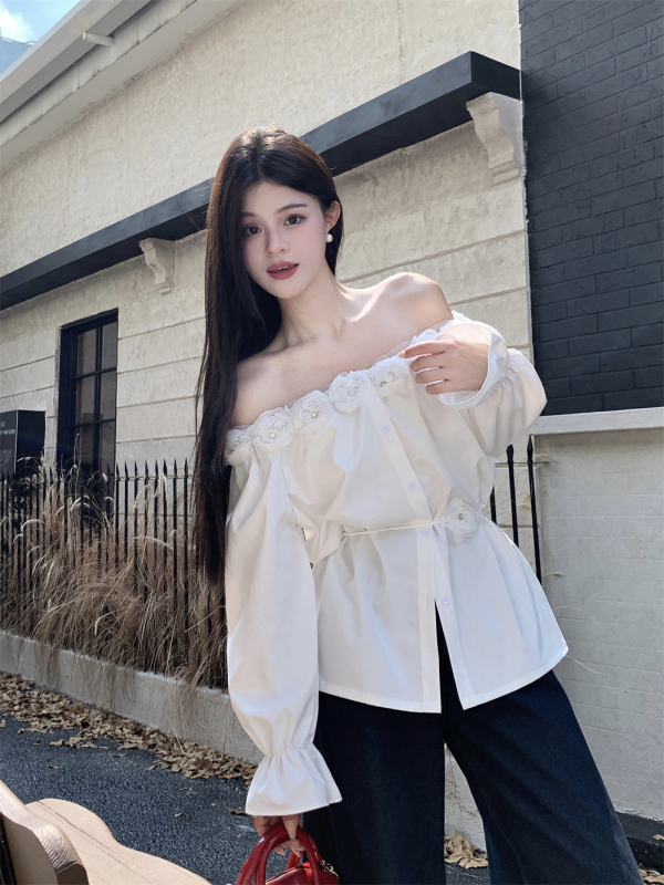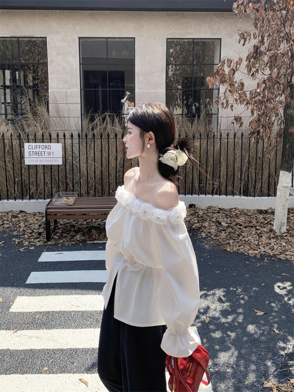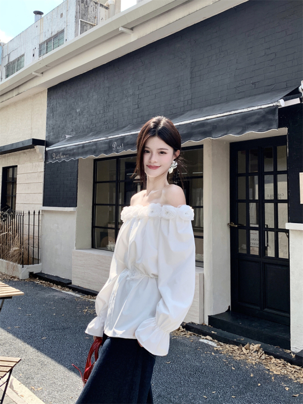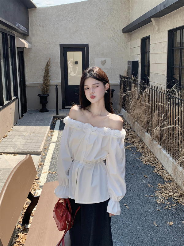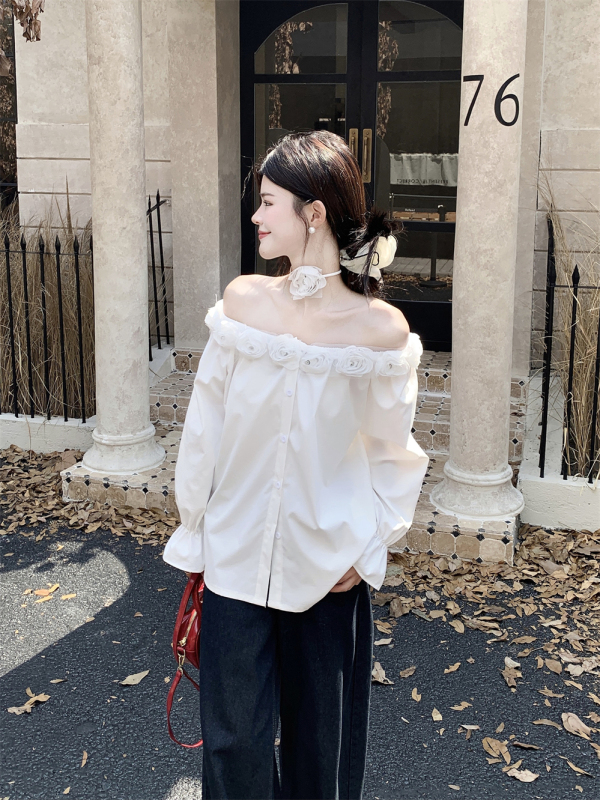One-shoulder design, inadvertently revealing the delicate collarbone, full of pure desire atmosphere. The flower decoration on the neckline is sweet and romantic, as if you are wearing spring on your body