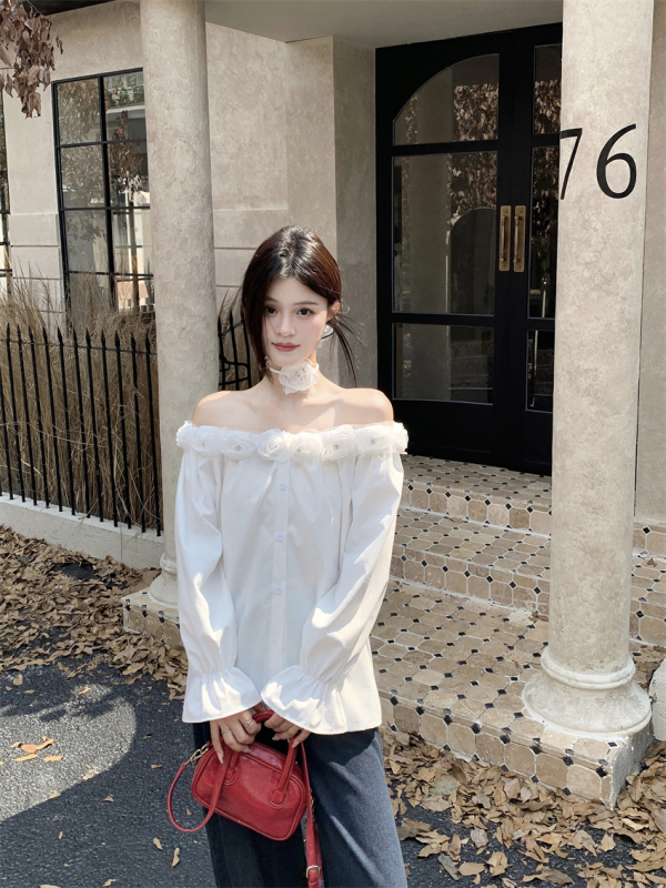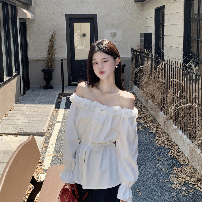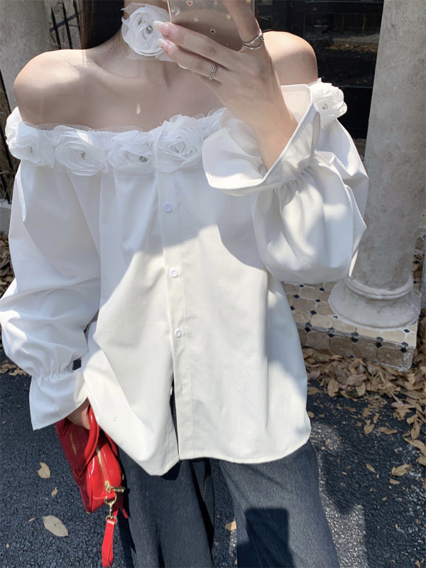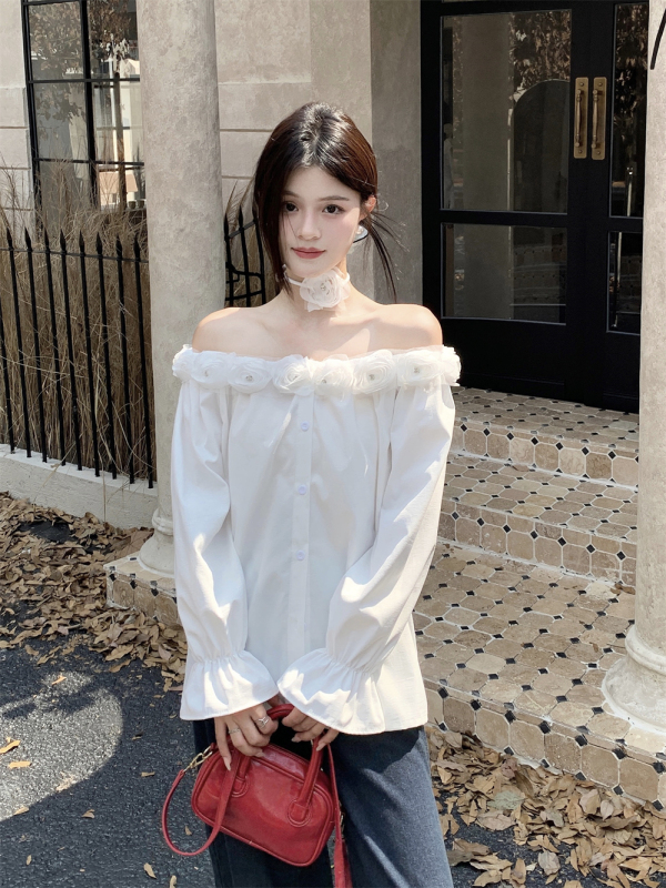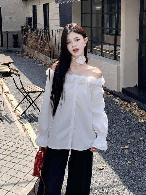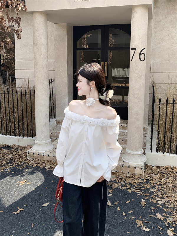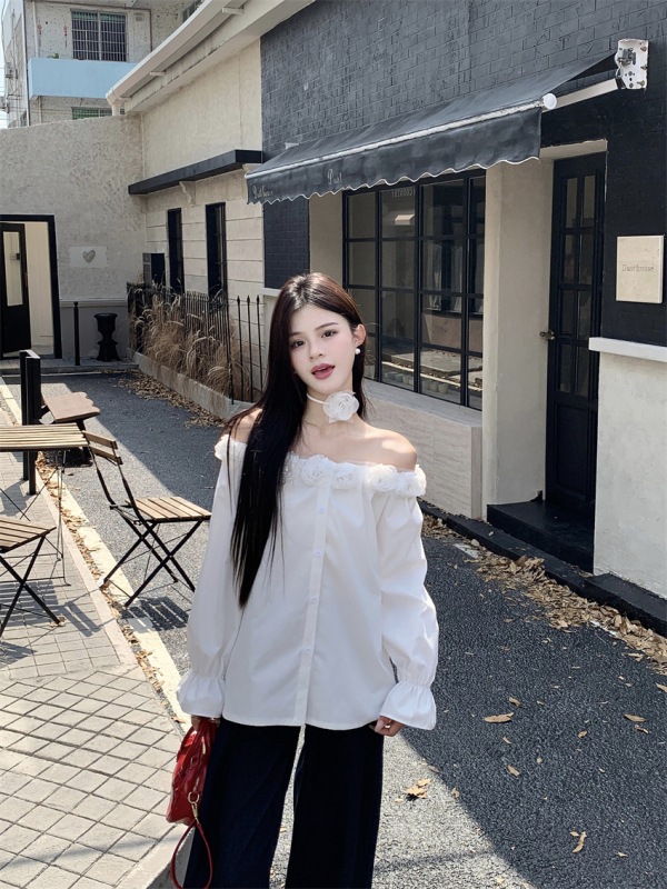 One-shoulder design, inadvertently revealing the delicate collarbone, full of pure desire atmosphere. The flower decoration on the neckline is sweet and romantic, as if you are wearing spring on your body