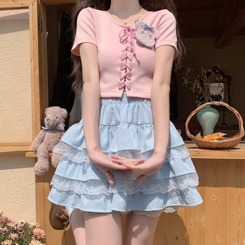- 流行元素/工藝:蕾絲+拼接+荷葉邊
