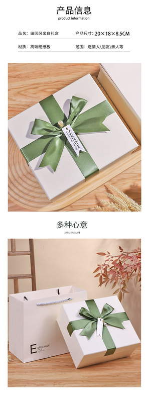 - 規格型號:田園風米白色蝴蝶結禮盒;禮盒+禮袋:20*18*8.5cm