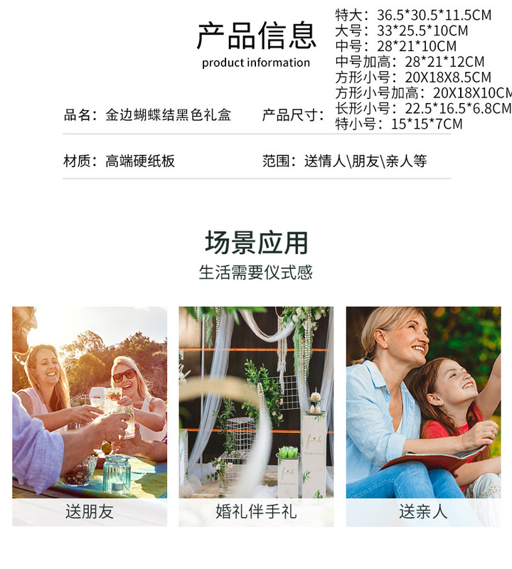 - 規格型號:金邊蝴蝶結黑色禮盒;特大號禮盒+禮袋:36.5x30.5x11.5cm