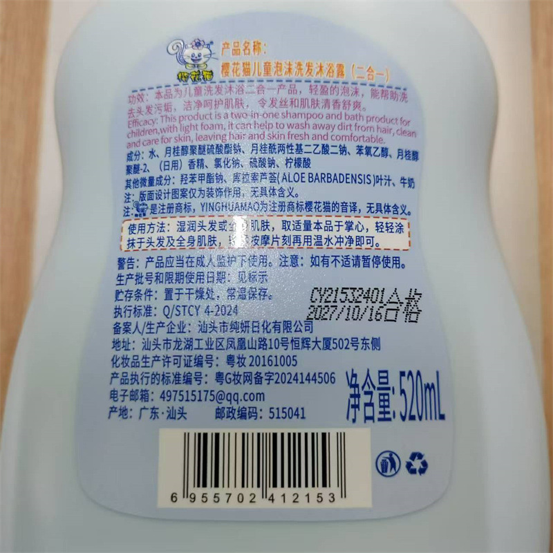 - 淨含量:櫻花貓蜜桃泡沫二合一520ml