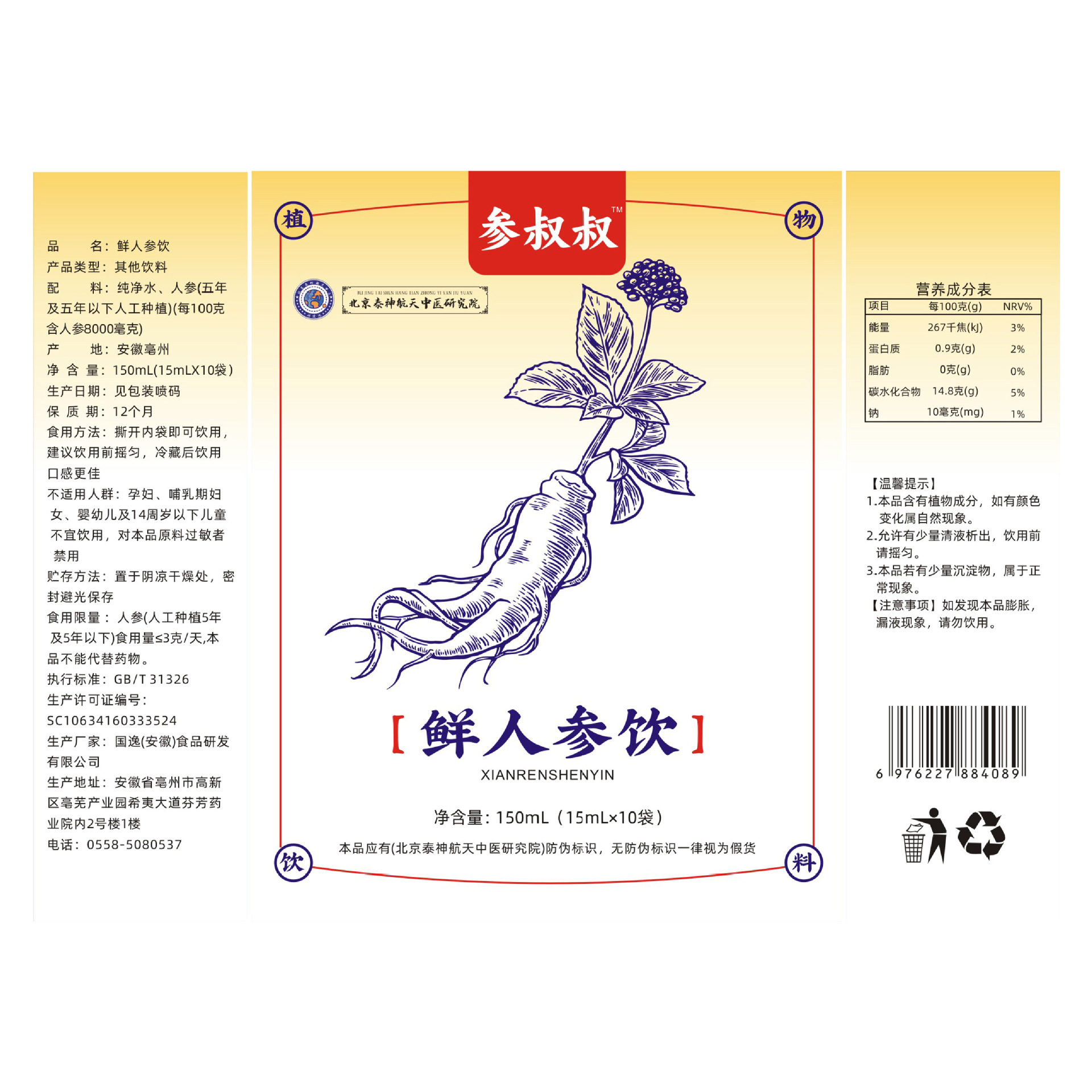 - Packaging Specification: Fresh Ginseng Beverage 150mL (15mL x 10 bags)