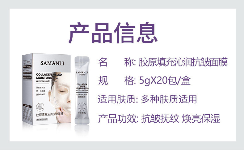 - 產品名稱:莎曼莉膠原填充沁潤抗皺面膜
