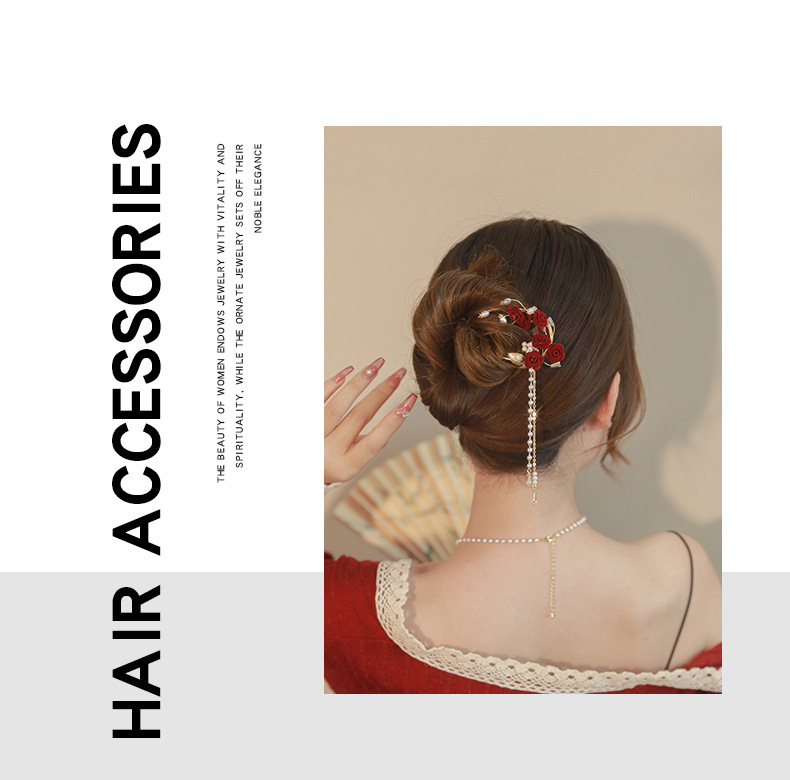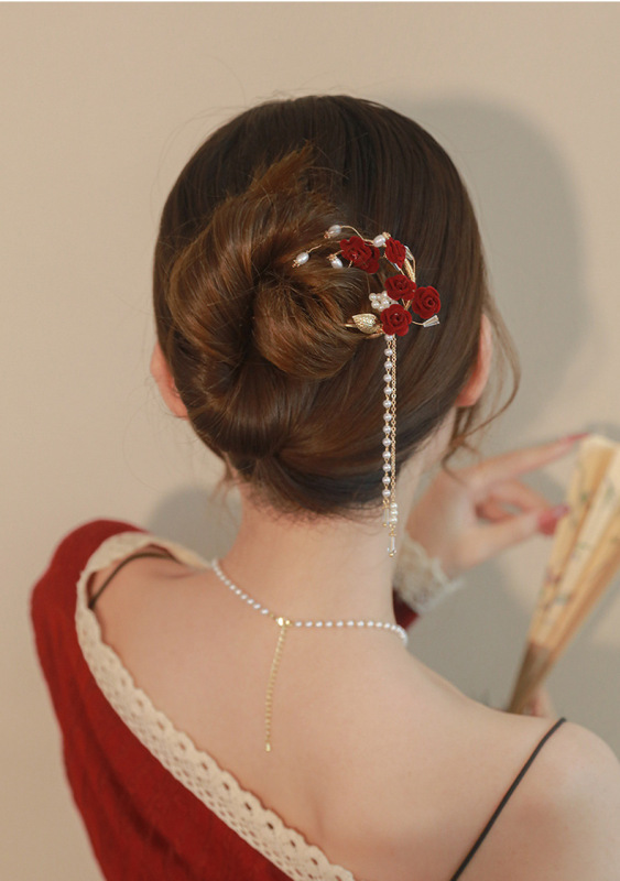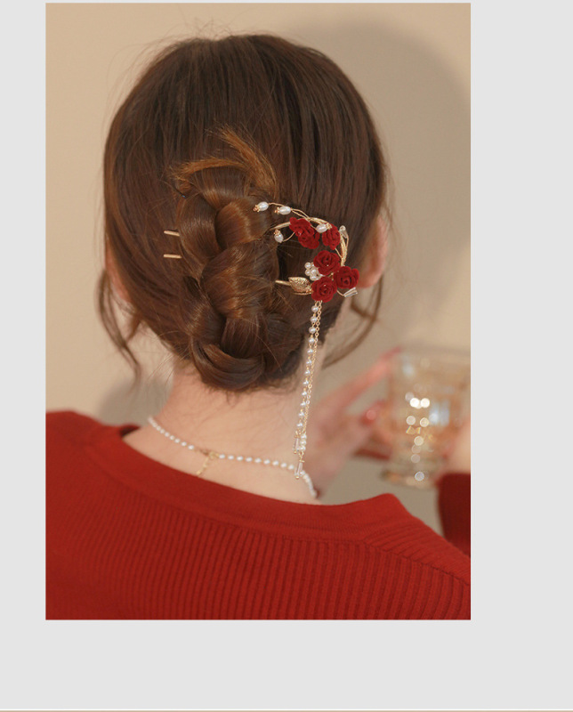 - 流行元素:古風紅色玫瑰花流蘇髮簪