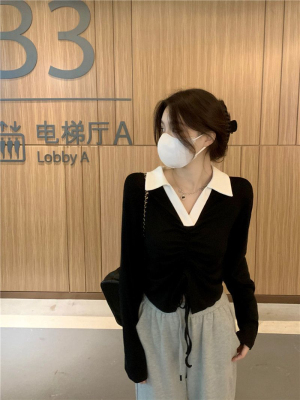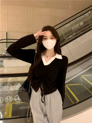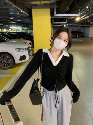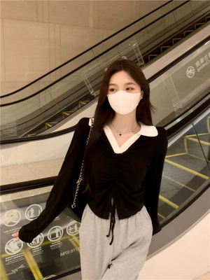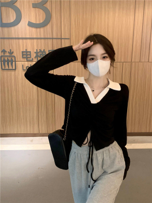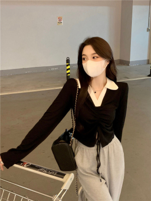 Mineb 2022 pure air draw cord polo collar long-sleeved t-shirt women's short top