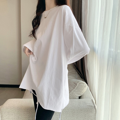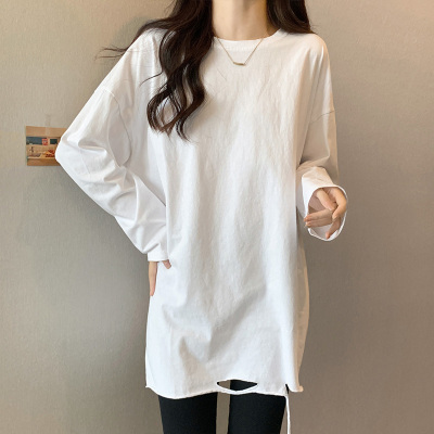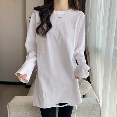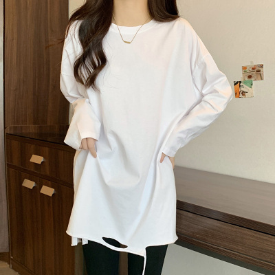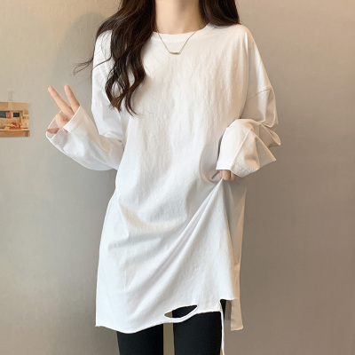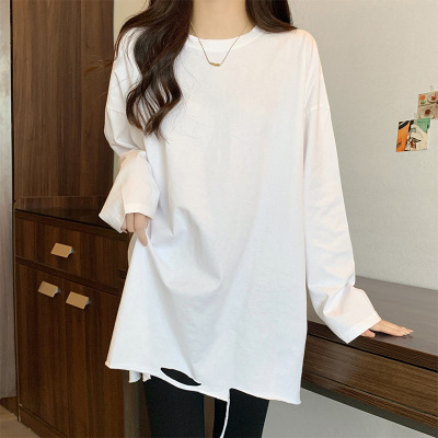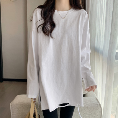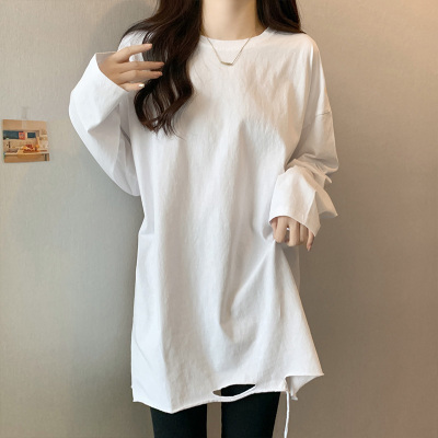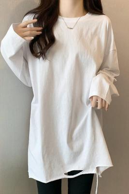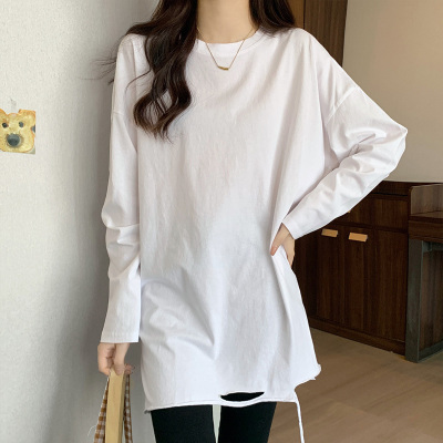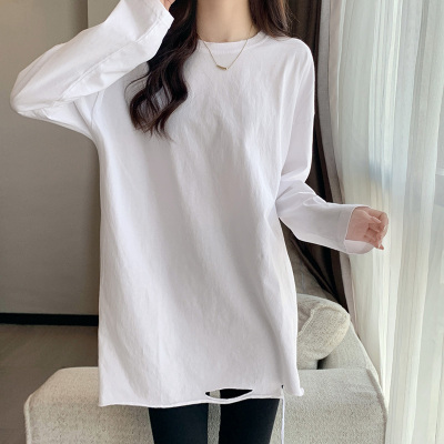 Actual shot of mid-length pure cotton bottoming shirt for women in autumn and winter, layered sweatshirt, loose long-sleeved T-shirt, ripped top