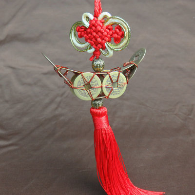 【規格】:掛件總長約33cm,路路通銅錢球直徑約5cm,中國結寬約4.8cm,流蘇長約13cm,單個銅錢直徑約2.3cm