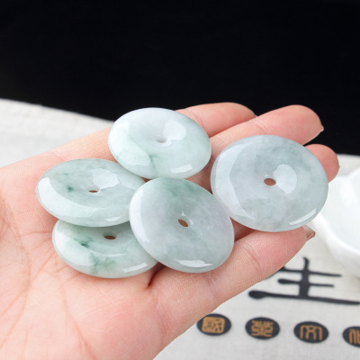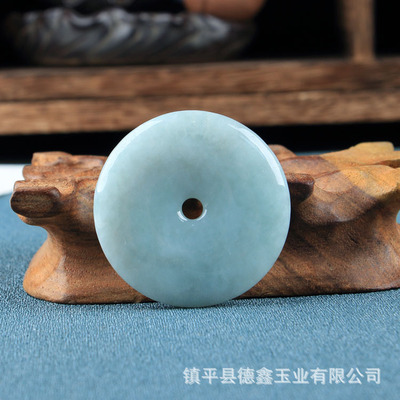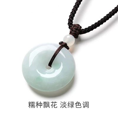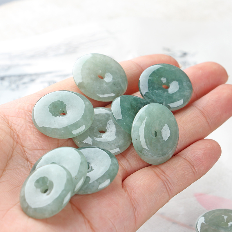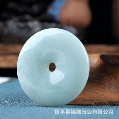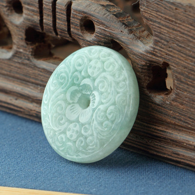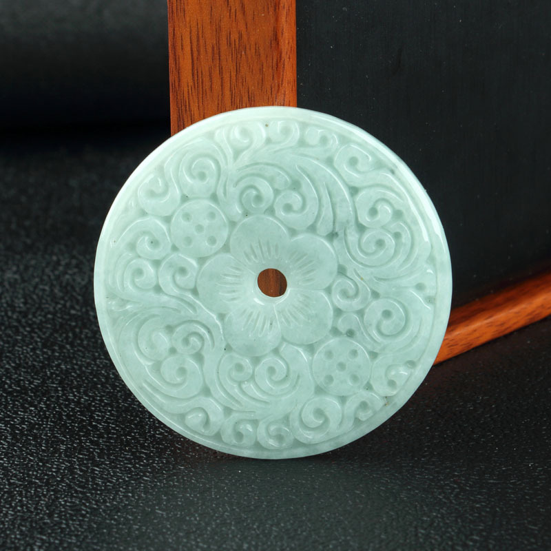 Emerald A-grade Peace Button Pendant: Bean-Blue with Floating Flowers, Available in Medium and Large Sizes—35mm and 50mm