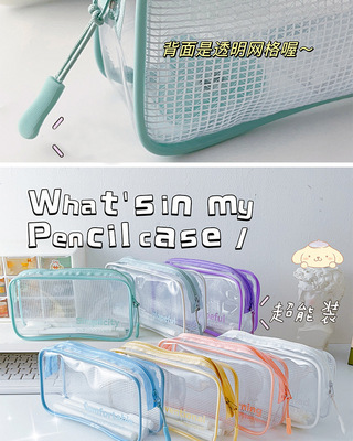 Wholesale PVC waterproof transparent mesh pencil bag for primary school students in the beginning of school season, small fresh stationery bag