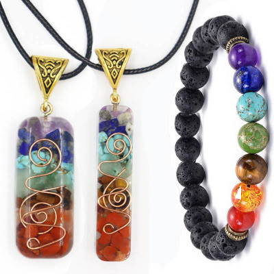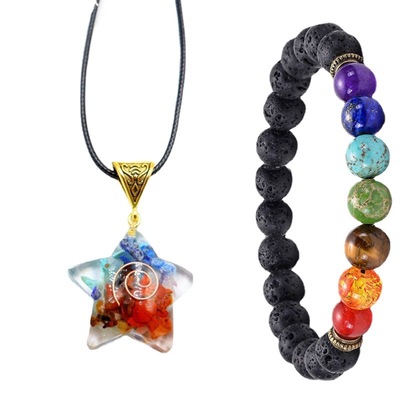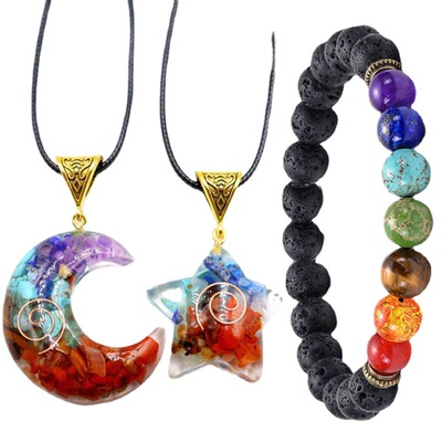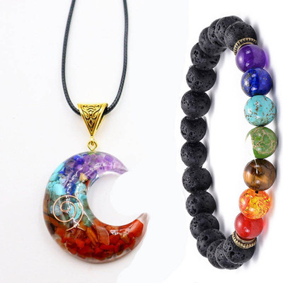Rainbow Pebble Resin Moon Pendant, Natural Crystal Gemstone Resin Chakra Moon Necklace Bracelet Set