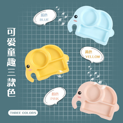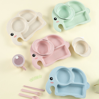 Creative cartoon elephant-shaped wheat straw baby plate with bowl, spoon, fork, chopsticks, cup, and divided plate set for children