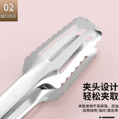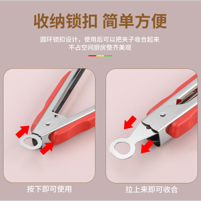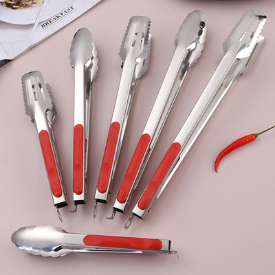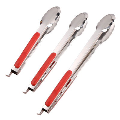 Stainless steel thickened red handle three-line food tongs, barbecue tongs with heat-resistant and bread-friendly design, oil-drippable outdoor self-service tongs