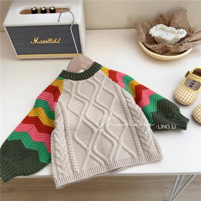 Pineapple Brand 2024 Spring New Korean Girls' Contrast Color Wave Lantern Sleeve Sweater Lamb Wool Denim Overalls