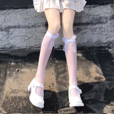 Lolita Summer Japanese Style Ankle Socks for Girls, Plain Color with Butterfly Bow, Thin White Mid-Calf Socks